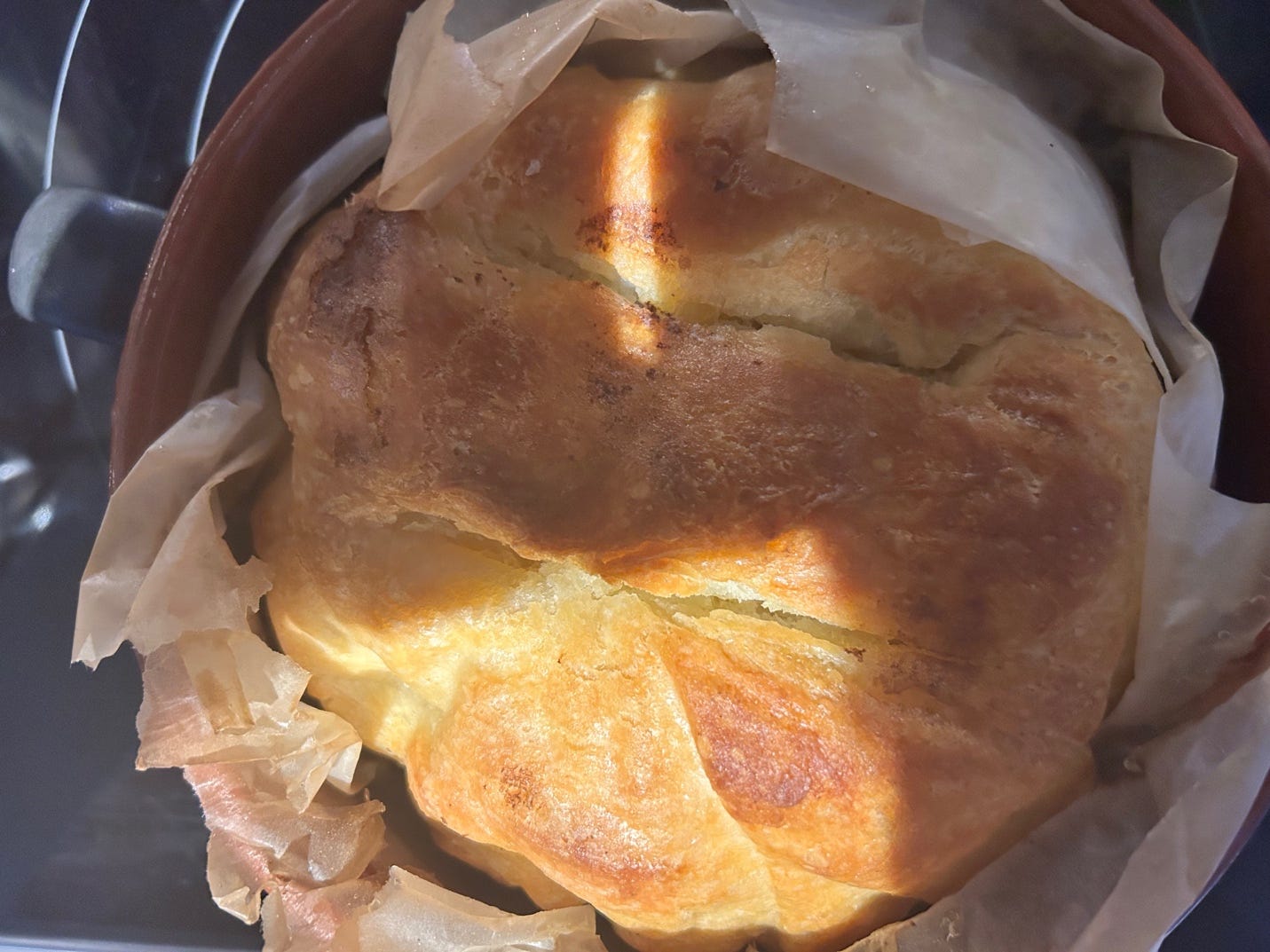 Secondly, I can make this bread this afternoon because I am at home sitting at my dining room table not sitting in front of a screen in my old cubicle drafting a briefing note. I am so full of gratitude and sit with a smile on my face that resembles that wrinkly crust.